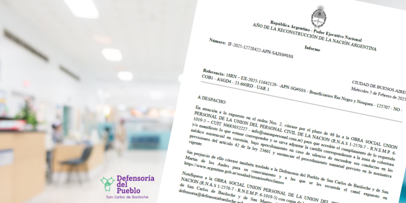 Las autoridades de la Superintendencia de Salud de la Nación intervinieron en el requerimiento enviado por las Defensoría del Pueblo de San Carlos de Bariloche, junto a la Defensoría del Pueblo y el Ambiente de San Martín de los Andes, en defensa a los derechos reclamados por los afiliados de la Obra Social Unión Personal Civil de la Nación de la ciudad de Neuquén y de la ciudad de Bariloche.
